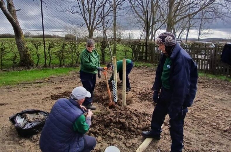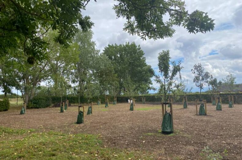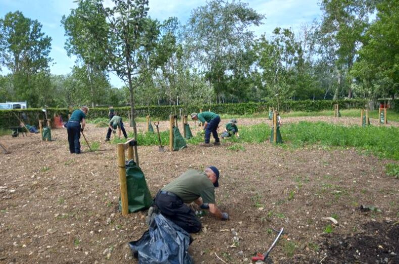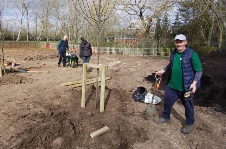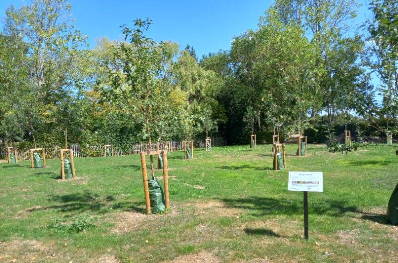 Through the autumn and winter of 2024/25 parks conservation volunteers helped to prepare the ground for the start of the tree planting season. The volunteers had to contend with harder than expected soil conditions and removal of some older buried and broken hard surfaces. Holes were dug and the already growing trees were planted. Support stands and water bags were attached to the trees during the summer season while these tender young trees become more established. The conservation volunteers returned several times during the year and will continue to return to check and maintain the area.