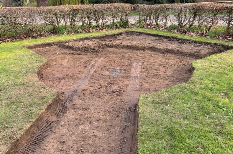 Ground preparations started with, beds and paths measured out. Topsoil started to be removed, the bedding areas were then backfilled with a few tons of well rotten manure and topsoil, which was left to settle for a few months. The path and wrought iron fencing were installed.
